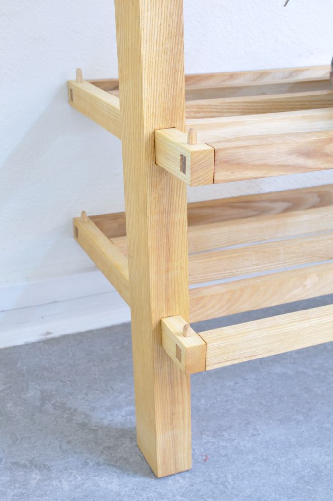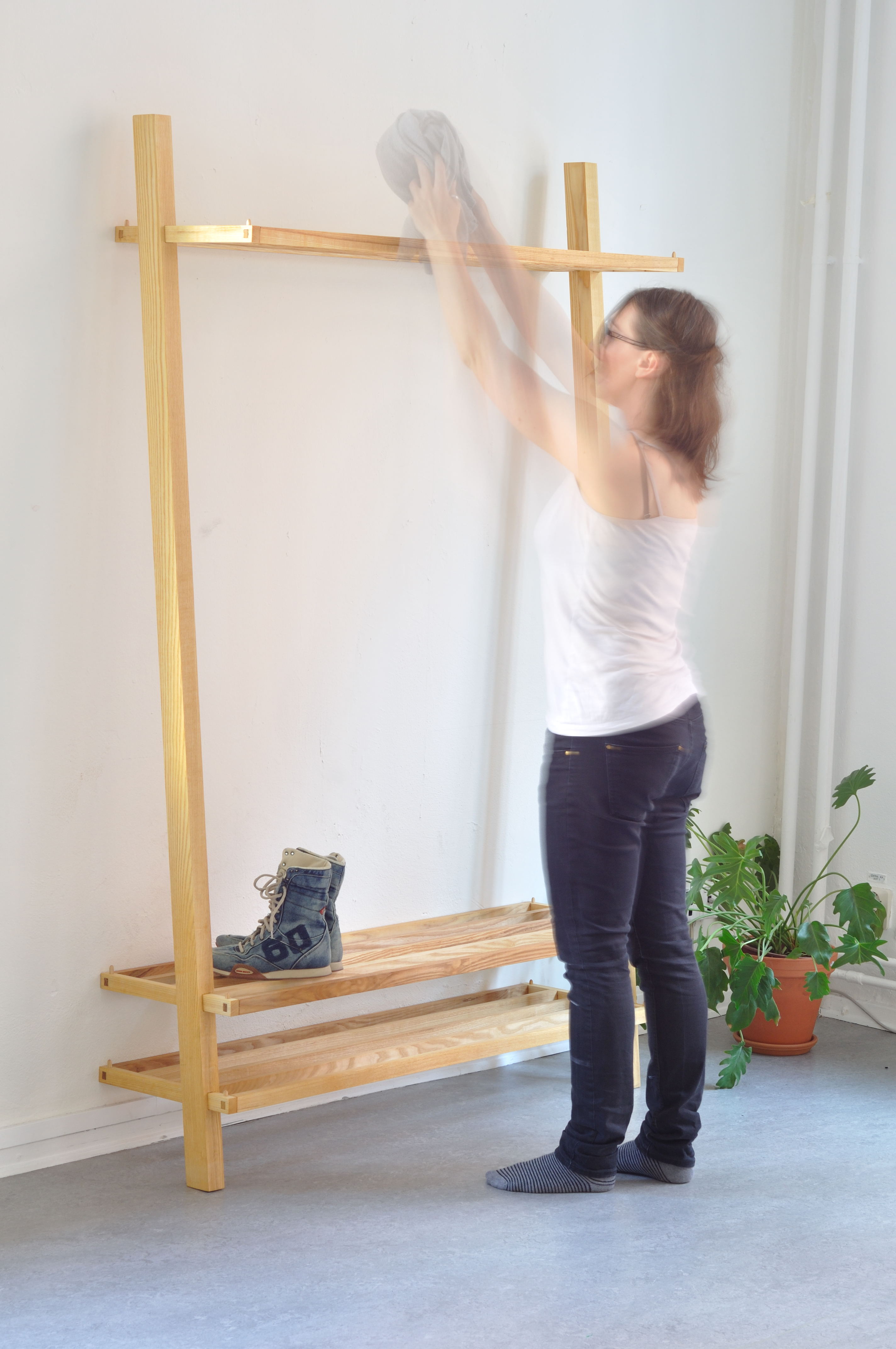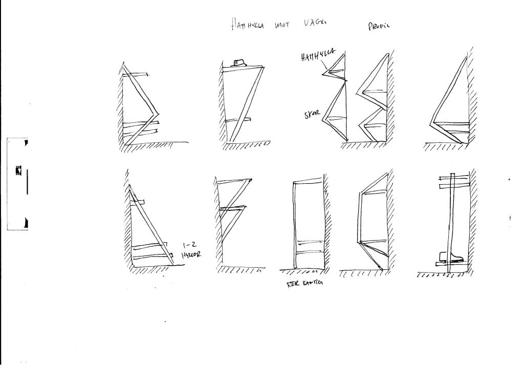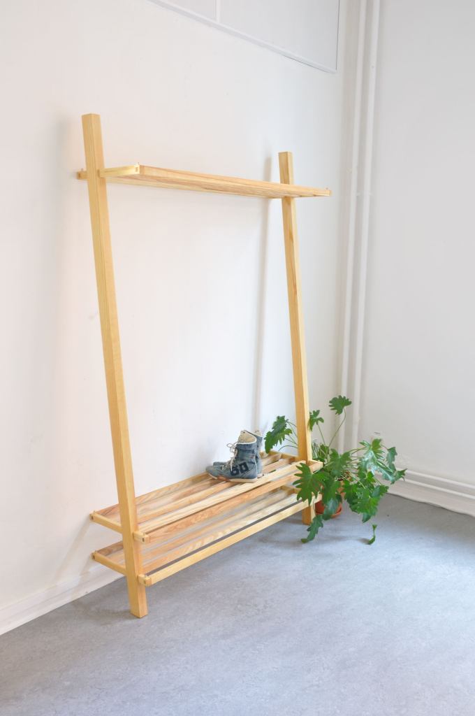 This shelf came out of the assignment to create your own project and where I lived we had a very small shoe rack. My boyfriend at the time had size 48,5 (EU size) so every time he placed his shoes on the shoe rack there was about 1/3 of his shoes still hanging over into the open air. Therefore the measure is deeper than a regular storage, and also rather tall to fit both his and my heights. Since I’ve moved a lot during my lifetime it was important for me to make it possible to collapse.