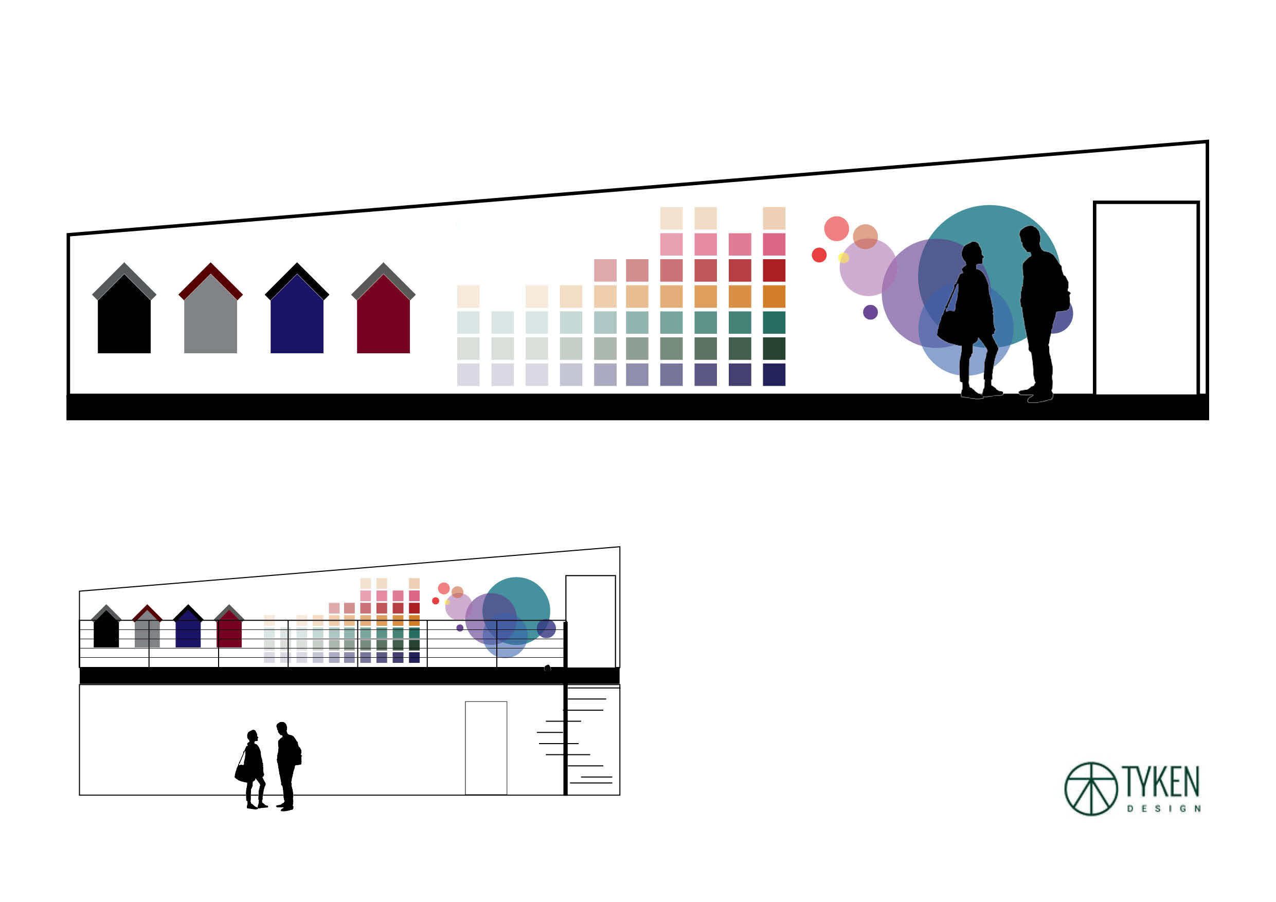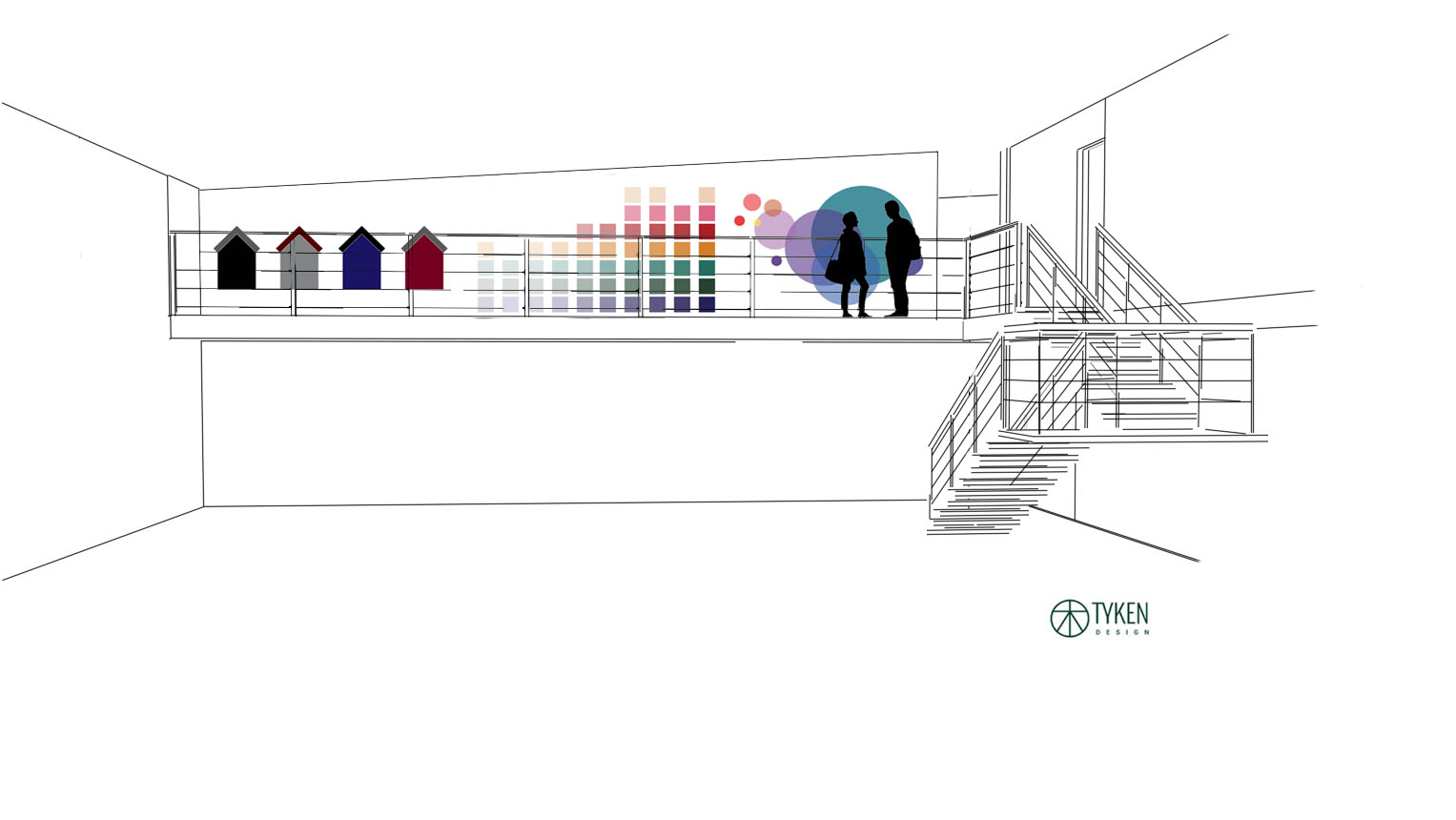 A big producer of paint wanted to have a floor plan and suggestion of how to display color samples on the balcony outside the conference area. This area is overlooking the testing area and was supposed to be the transition into the meeting room. The producer produces everything from paints for interior to facade and tin roof which should reflect in the display area.